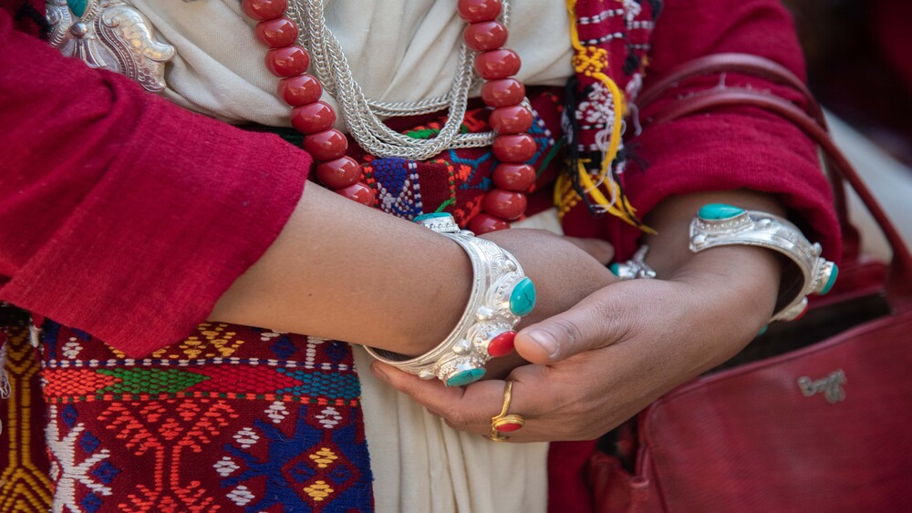 They adorn themselves with beautiful stone and silver ornaments, necklaces, bangles and earrings. the broach is called Zurok, The long silver necklace is called Janjiri, the stone necklace is called Gonkor.